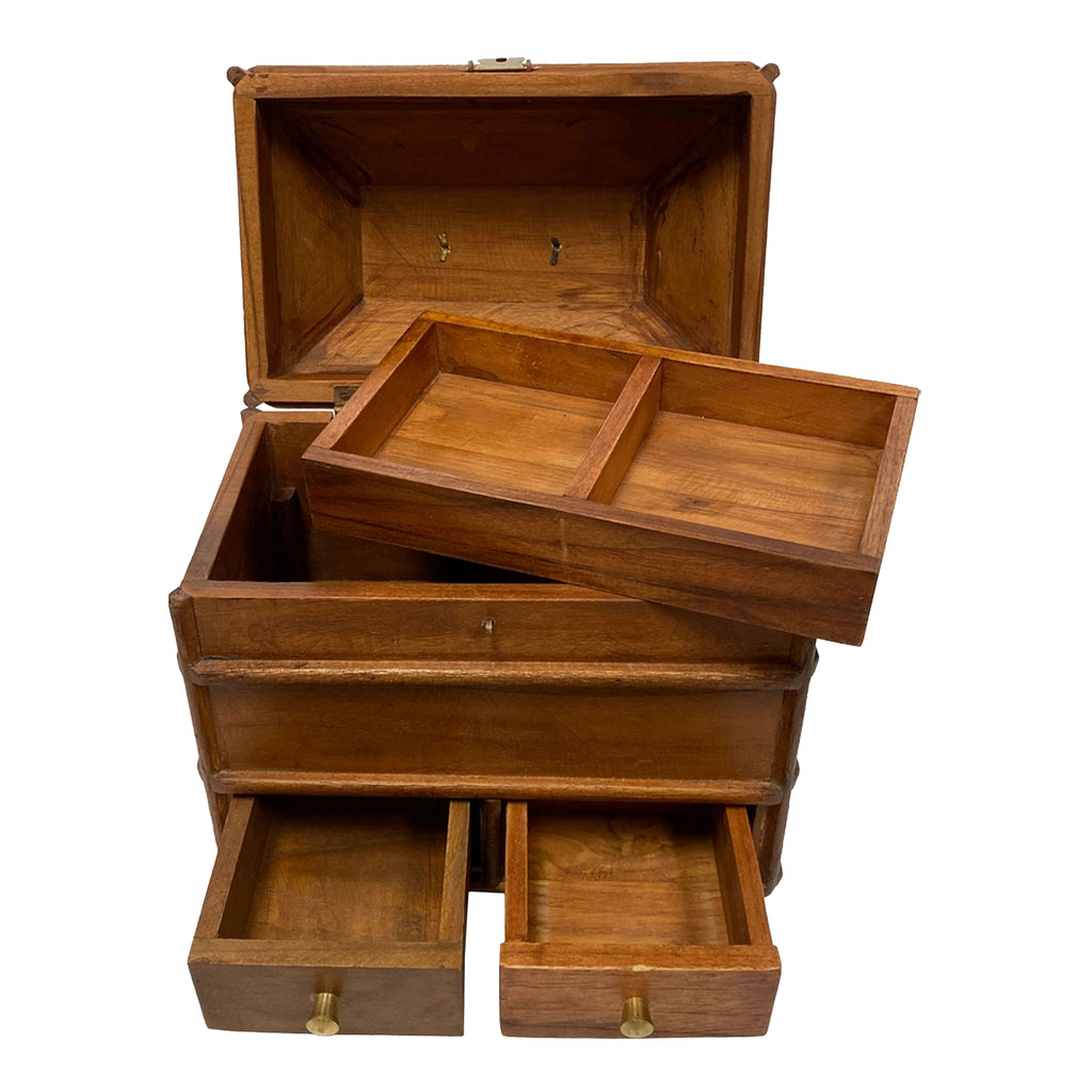 Built for life on the move. Inspired by 18th-century campaign chests carried through distant terrains, this mango and teak wood chest offers organized purpose with brass details, two lower drawers, and a removable tray within. Durable, wax-finished, and elegant enough to follow you anywhere. Dimensions: 20" x 14" x 9" in.